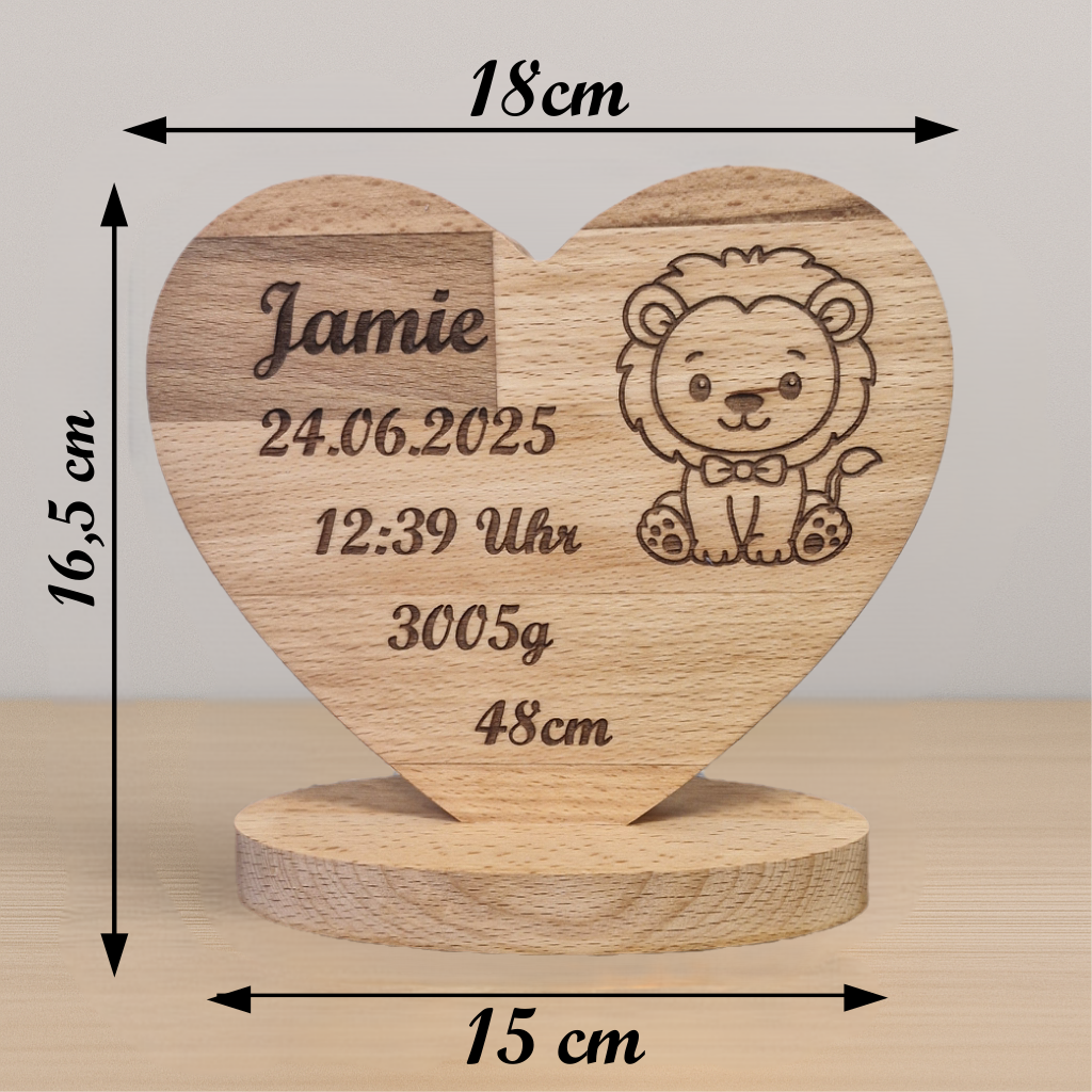 Dein Wunschname, alle Geburtsdaten und euer Lieblingstier werden liebevoll ins Holz graviert – ein zeitloses Herz, das den Start ins Leben festhält. Handgemacht, persönlich, unvergänglich. Jetzt personalisieren und ein Erinnerungsstück schenken, das jeden Tag Freude macht! 🎁